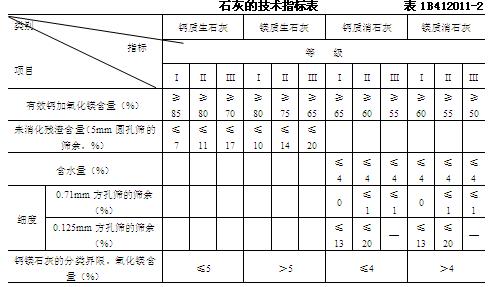 2.石灰:石灰技术指标应符合表1B412011-2的规定,应尽量缩短石灰的存放时间。石灰在野外堆放时间较长时,应覆盖防潮。