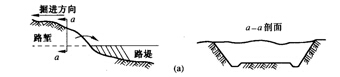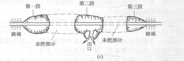 (3)分段纵挖法:该法适用于过长,弃土运距过远,一侧堑壁较薄的傍山路堑开挖。