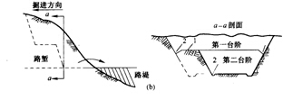 (2)多层横向全宽挖掘法:从开挖路堑的一端或两端按断面分层挖到设计标高,适用于挖掘深且短的路堑。