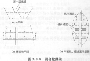 混合式挖掘法是多层横向全宽挖掘法和通道纵挖法混合使用。先沿路线纵向挖通道,然后沿横向坡面挖掘,以增加开挖面。该法适用于路线纵向长度和挖深都很大的路堑开挖。