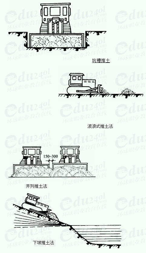 推土机开挖土方作业由切土、运土、卸土、倒退(或折返)、空回等过程组成一个循环。影响作业效率的主要因素是切土和运土两个环节。其作业方式一般有:坑槽形推土法、波浪式推土法、并列推土法、下坡推土法、接力推土法。
