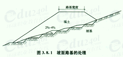 6.路堤填筑时,当原地面纵坡大于12%或横坡陡于1:5时,应按设计要求挖台阶,或之中成坡度向内并大于4%,宽度大于2m,并予以夯实。