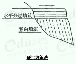 ④联合填筑法:路堤下层用横向填筑而上层用水平分层填筑。适用于因地形限制或填筑堤身较高,不宜采用水平分层法或横向填筑法自始至终进行填筑的情况。多在地势平坦,或两侧有可利用的山地土场的场合采用。