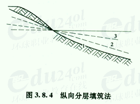 ②纵向分层填筑法:常用于地面纵坡大于12%的用推土机从路堑取料填筑距离较短的路堤。缺点是不易碾压密实。