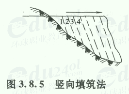 ③竖向填筑法:不易压实,仅用于无法自下而上填筑的深谷、陡坡、断岩、泥沼等机械无法进场的路堤。