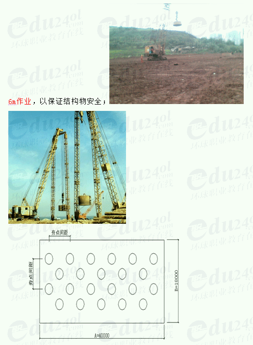 分层厚度:强夯压实要求分层进行。分层厚度5.0m左右,高度20m以内分四进行,底层稍厚,但不超过5.5m,面层稍薄,一般为4.0m。