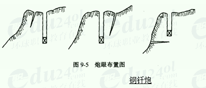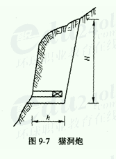 (4)猫洞炮系指炮洞直径为0.2~0.5m,洞穴成水平或略有倾斜(台眼),深度小于5m,用集中药锯炮洞中进行爆炸的一种方法。