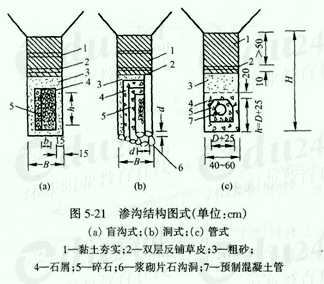 渗沟有填石渗沟、管式渗沟和洞式渗沟三种形式,三种渗沟均应设置排水层(或管、洞)、反滤层和封闭层。