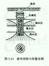 渗井直径50~60cm,井内填置材料按层次在下层透水范围内填碎石或卵石,上层不透水层范围内填砂或砾石,填充料应采用筛洗过的不同粒径的材料,应层次分明,不得粗细材料混杂填塞,井壁和填充料之间应设反滤层。