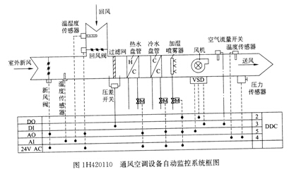 安装公司根据设计院提供的通风空调设备自动监控系统框图(见图1H420110),对通风空调设备系统进行了调试检测。