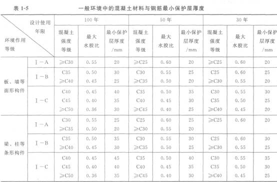 一般环境中的配筋混凝土结构构件,其普通钢筋的保护层最小厚度与相应的混凝土强度等级、最大水胶比应符合表1-5的要求。