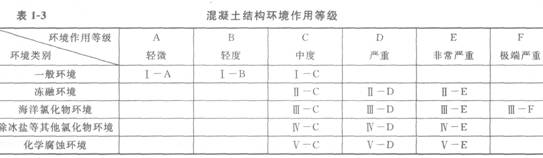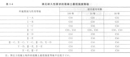 结构构件的混凝土强度等级应同时满足耐久性和承载能力的要求,故《混凝土结构耐久性设计规范》(GB/T50476-2008)中对配筋混凝土结构满足耐久性要求的混凝土最低强度等级作出相应规定,见表1—4。