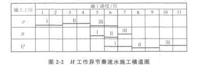 事件3:在H工作开始前,为了缩短工期,施工总承包单位将原施工方案中H工作的异节奏流水施工调整为成倍节拍流水施工。原施工方案中H工作异节奏流水施工横道图如图2—2所示(时间单位:月)。