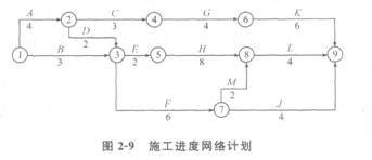 某综合楼工程,地下1层,地上10层,钢筋混凝土框架结构,建筑面积28500m2。某施工单位与建设单位签订了工程施工合同,合同工期约定为20个月。施工单位根据合同工期编制了该工程项目的施工进度计划,并且绘制出施工进度网络计划如图2-9所示(单位:月)。