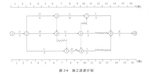 1.根据第4周末的检查结果,实际进度前锋线如图2—7所示。
