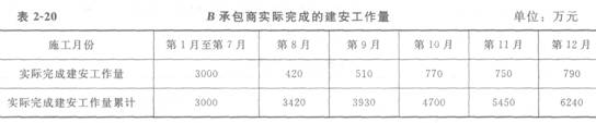(5)工程保修金为合同总价的5%,在工程结算时一次扣留,工程保修期为正常使用条件下,建筑工程法定的最低保修期限。经业主工程师代表签认的B承包商实际完成的建安工作量(第1月至第12月)见表2—20。