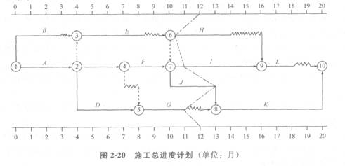 3.根据第12个月末进度检查结果,绘出进度前锋线如图2—20所示。
