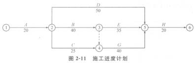 某建设单位和施工单位按照《建设工程施工合同(示范文本)》(GF-1999—0201)签订了施工合同,合同中约定:建筑材料由建设单位提供;由于非施工单位原因造成的停工,机械补偿费为200元/台班,人工补偿费为50元/工日;总工期为120d;竣工时间提前奖励为3000元/d,误期损失赔偿费为5000元/d。经项目监理机构批准的施工进度计划如图2-11所示(单位:d)。
