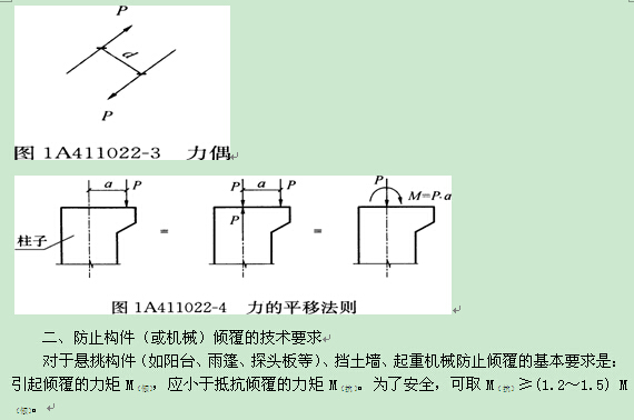 力使物体绕某点转动的效果要用力矩来度量。“力矩=力×力臂”,即M=P·a。转动中心称力矩中心,力臂是力矩中心O点至力P的作用线的垂直距离a,见图1A411022—1。力矩的单位是N·m或kN·m。