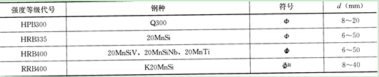 钢筋常用种类、代表符号和直径范围 表1A411031-1