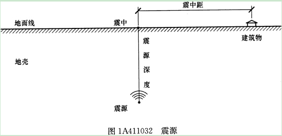 地壳深处发生岩层断裂、错动的部位称震源。震源正上方的地方位置叫震中。震中附近地面震动最厉害,也是破坏最严重的地区,称为震中区。地面某处至震中的水平距离称为震中距。震中至震源的垂直距离称为震源深度。如图1A411032所示。