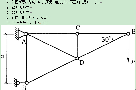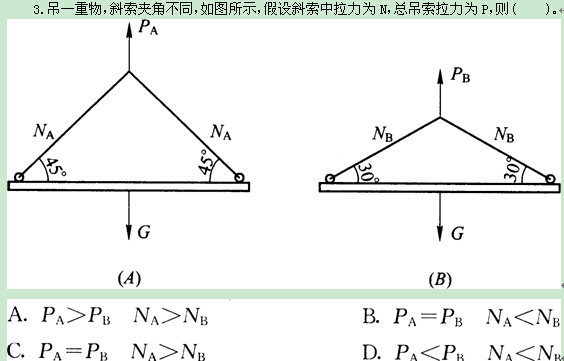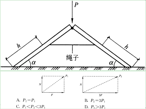1.图示人字梯旋转在光滑(忽略摩擦)地面上,顶端人体重量为P。关于绳子拉力与梯子和地面夹角以、绳子位置高度a关系的说法,正确的是( )。