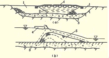 1-截流戗堤 ;2-龙口;3-覆盖层;4-浮桥;5-截流体