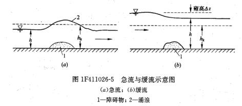 (2)缓流:当水深大于临界水深,佛汝德数小于l的水流,称为缓流。缓流表现形态为:当水流遇到障碍物时,障碍物对水流的干扰可向上游传播,表现为上游的水位壅高。