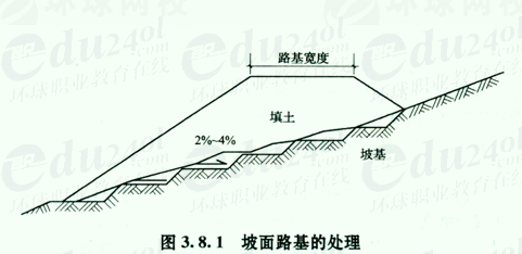 3、防路基侧向滑移方面:当地面坡度陡于1:5时,需修成台阶形式,每层台阶高度≯