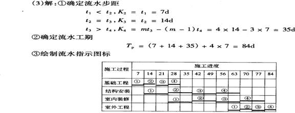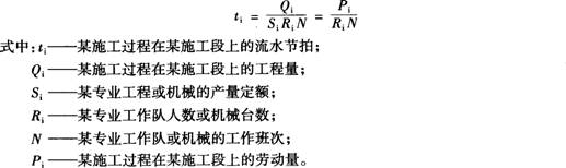 (2)答:流水节拍是指某个专业施工队在各个施工段完成各自施工过程所必须持续的作业时间,通常以ti;表示,其计算公式是: