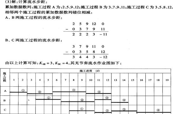 (2)答:无节奏流水的流水步距K值的计算,是采用“相邻队组每段作业时间累加数列错位相减取最大差”的方法,即首先分/考 试大/别将两相邻工序每段作业时间逐项累加得出两个数列,后续工序累加数列向后错一位对齐,逐个相减最后得到第三个数列,从中取最大值,即为两工序施工队间的流水步距。