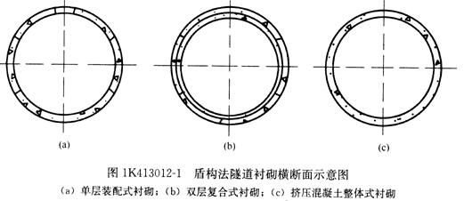 按管片螺栓手孔大小,可将管片分为箱型和平板型两类。箱型管片是指因手孔较大而呈肋板型结构,手孔较大不仅方便了接头螺栓的穿人和拧紧,而且也节省了材料,使单块管片重量减轻,-便于运输和拼装。但因截面削弱较多,在盾构千斤顶推力作用下容易开裂,故只有强度较大的金属管片才采用箱型结构。当然,直径和厚度较大的钢筋混凝土管片也有采用箱型结构的。在箱型管片中纵向加劲肋是传递千斤顶推力的关键部位,一般沿衬砌环向等距离布置,加劲肋的数量应大于盾构千斤顶的台数,其形状应根据管片拼装和是否需要灌注二次衬砌的施工要求而定,见图1K413012-2。平板型管片是指因螺栓手孔较小或无手孔而呈曲板型结构的管片,由于管片截面削弱少或无削弱,故对盾构千斤顶推力具有较大的抵抗力,对通风的阻力也较小。无手孔的管片也称为砌块,现代的钢筋混凝土管片多采用平板型结构见图1K413012-3 。