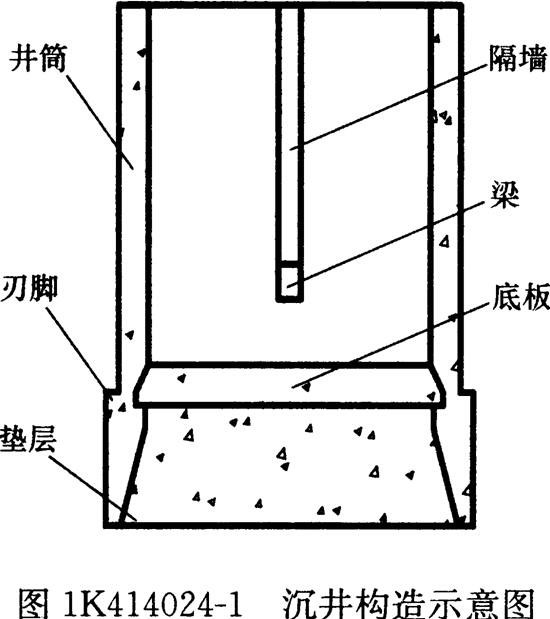 沉井的组成部分包括井筒、刃脚、隔墙、梁、底板,如图1K414024-1所示。