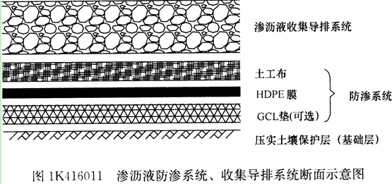 垃圾卫生填埋场填埋区工程的结构层次从上至下主要为:渗沥液收集导排系统、防渗系统和基础层。系统结构形式如图1K4160ll所示。