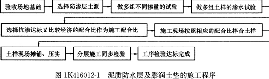 泥质防水层施工技术的核心是掺加膨润土的拌合土层施工技术。理论上,土壤颗粒越细,含水量适当,密实度高,防渗性能就越好。膨润土是一种以蒙脱石为主要矿物成分的黏土岩,膨润土含量越高抗渗性能越好。但膨润土是一种比较昂贵的矿物,且土壤如果过分筛选,会增大投资成本,因此实际做法是:选好土源,检测土壤成分,通过做不同掺量的土样,优选最佳配合比;做好现场拌合工作,严格控制含水率,保证压实度;分层施工同步检验,严格执行验收标准,不符合要求的坚决返工。施工单位应根据上述内容安排施工程序和施工要点。