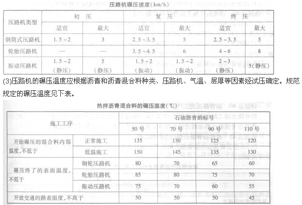 (1)沥青路面施工应配备足够数量、状态完好的压路机,选择合理的压路机组合方式,根据摊铺完成的沥青混合料温度情况严格控制初压、复压、终压(包括成型)时机。压实层最大厚度不宜大于100mm,各层应符合压实度及平整度的要求。