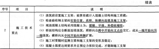 (1)钢粱预制并焊接传剪器; (2)架设钢梁; (3)安装横粱(横隔粱)及小纵梁; (4)安装预制混凝土板并浇筑接缝混凝土或支搭现浇混凝土桥面板的模板并铺设钢筋; (5)现浇混凝土; (6)养护; (7)张拉预应力束; (8)拆除临时支架或设施 |
