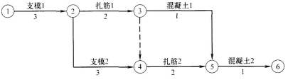 ①→②→③→⑤→⑥、①→②→③→④→⑤→⑥和①→②→④→⑤→⑥,也可表示为:支模1→扎筋1→混凝土1→混凝土2、支模1→扎筋1→扎筋2→混凝土2和支模1→支模2→扎筋2→混凝土2。