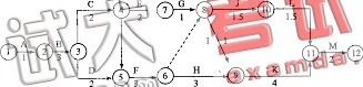 2.不增加N工作的原计划机械闲置时间情况: 从图中可以看出:EF3-4一ES5-6-6,EF5-6=ES8-10=9。即工作C的最早完成时间等于工作F的最早开始时间,工作F的最早完成时间等于工作J的最早开始时间。故安排挖土机按C-F-J施工顺序施工可使机械不闲置。增加土方工程N机械闲置时间情况:
