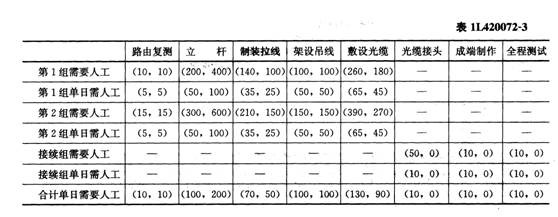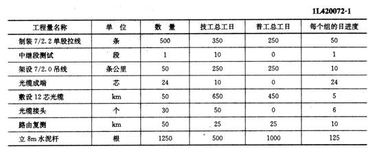 某通信工程公司承揽到一个架空光缆线路工程,线路全长50km,由一个中继段构成,施工单位承包全部材料。合同规定此工程于8月1日开工,月31日完工。该施工单位接到此项目后进行了现场摸底,并在线路上确定了一个临时驻点。通过现场摸底发现,此工程全程地理条件相似,无复杂施工地段及特殊跨越点,此驻点距线路两侧的端点分别为20km和30km。对此,项目经理决定分两个作业组同时完成驻点两侧的线路施工任务;竣工资料由项目经理部相关人员在测试阶段编制。由于该施工单位工程较多,仅能为此工程提供一套测试仪表和接续设备。项目经理部针对此工程编制的工作量、用工量及日进度内容见表1L420072-1