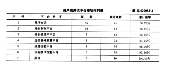 在X市本地网通信线路工程中,某施工处承担户线安装部分,包括分线设备下线(称爬杆线)和用户室外线两部分。线缆走向整齐、合理,并于8日30日全部安装完成,从9月1日开始由技术人员对线缆进行测试,在测试过程中发现其中存在很多质量问题,统计如表1L420083-1所示: