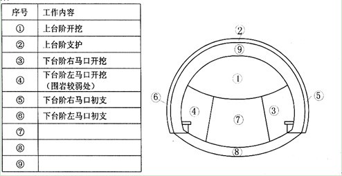 | 33、 (二)背景资料 某施工单位承接了一条二级公路的隧道施工项目,该隧道主要穿越砂层泥岩和砂岩,岩层节理、裂隙发育,富含裂隙水。隧道全长800m,设计净高5m,净宽12m,为单洞双向行驶的两车道隧道。施工单位针对该项目编制了专项施工方案,其中包括工程概况、编制依据、劳动力计划等内容。拟采取如下图开挖方法施工,施工顺序如下图和表所示,并按①→⑨的顺序作业。针对该隧道施工过程中有可能出现突水安全事故的特点,编制了安全生产专项方案。 问题: 1.专项施工方案中的劳动力计划包括哪些类别的人员? 2.该方法的名称是什么?改正③→⑥的施工工序,说明修改原因。 3.补充表列⑦~⑨项工作的内容。 4.请指出安全专项方案的审批程序。 |