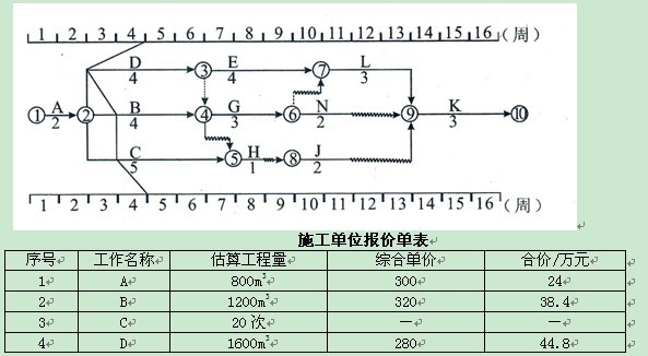 | 36、 (五)背景资料 某公路工程的施工合同工期为16周,项目监理机构批准的施工进度计划如下图所示(时间单位:周)。各工作均按匀速施工。施工单位的报价单(部分)见下表。 工程施工到第4周时进行进度检查,发生如下事件: 事件1:A工作已经完成,但由于设计图局部修改,实际完成的工程量为840m3,工作持续时间未变。 事件2:B工作施工时,遇到异常恶劣的气候,造成施工单位的施工机械损坏和施工人员窝工,损失1万元,实际只完成估算工程量的25%。 事件3:C工作为检验检测配合工作,只完成了估算工程量的20%,施工单位实际发生检验配合工作费用5000元。 事件4:施工中发现地下文物,导致D工作尚未开始,造成施工单位自有设备闲置4个台班,台班单价 300元/台班、折旧费100元/台班。施工单位进行文物现场保护的费用为1200元。 事件5: 项目部将部分工程进行劳务分包,在检查了该劳务公司具备相应的劳务分包资质后,项目部与该劳务公司依法签订了劳务分包合同,在报发包人、监理工程师备案时,监理工程师提出质疑。 问题: 1.根据第4周末的检查结果,逐项分析B C D三项工作的实际进度对工期的影响,并说明理由。 2.若施工单位在第4周末就B C D出现的进度偏差提出工程延期的要求,应批准工程延期多长时间?为什么? 3.施工单位是否可就事件2、4提出费用索赔?为什么?可以获得的索赔费用是多少? 4.事件3中C工作发生的费用如何结算? 5.前4周施工单位可得到的结算款为多少元? 6.试指出监理工程师质疑的原因。 |