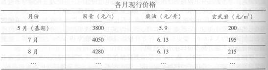 基期为当年5月,工程款按月计量,每月调整价差,该工程投标函投标总报价中,沥青占35%,柴油占15%,玄武岩占20%,各月价格如下表: