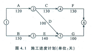 - 解析:1、关键线路:①→③→⑤→⑥(或B→E→G)。计算工期为390天,按此计划可以按合同工期要求完工。