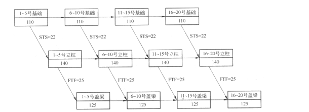 (2)每5个桥墩合并简化后1~5号基础和1~5号立柱之间就不是衔接关系了(即并不需要等待110d后才能进行1号墩的立柱施工),而是搭接关系。同理,所有每5个基础和立柱之间,立柱和盖梁之间都是搭接关系。基础和立柱之间是STS=22,立柱和盖梁之间是FTF=25。改正为: