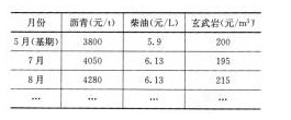 基期为当年5月,工程款按月计量,每月调整价差。该工程投标函投标总报价中,沥青占35%,柴油占15%,玄武岩占20%。施工单位7月份完成工程产值3156万元,8月份完成工程产值4338万兀。各月价格见右表。
