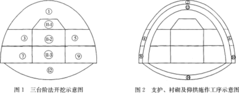 该地段地质条件复杂,勘探表明其围岩主要为弱风化硬质页岩,属Ⅳ~Ⅴ级围岩,稳定性差。由于地下水发育,特别是断层地带岩石破碎,裂隙发育,为保证施工安全,施工单位在该隧道施工中采用了TSP法进行超前地质预报,并进行相关监控量测。根据该隧道的地质条件和开挖断面,施工单位在施工组织设计中拟采用三台阶法施工,左线隧道施工工序划分如图1、图2所示。