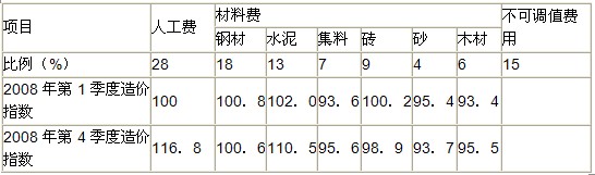 某工程项目合同价为1750万元,该工程签订的合同为可调值合同。合同报价日期为2008年4月1日。施工单位2008年第4季度完成产值为710万元。工程人工费、材料费构成比例以及相关季度造价指数见表1。