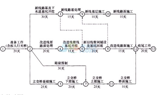 2.根据原有进度计划,计算确定“新线基层施工”的最早可能开始时间(假设工程为第0天末开始施工)。